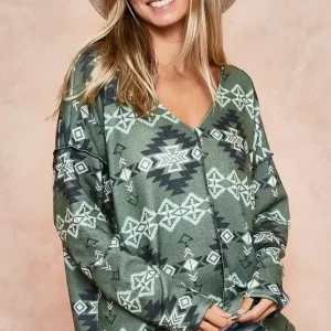 Aztec Print Brushed Out Stitching Detailed Top – Olive Combo