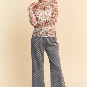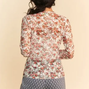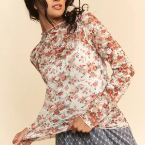 Floral Print Mesh Long Sleeve Layering Top – White/Orange Floral