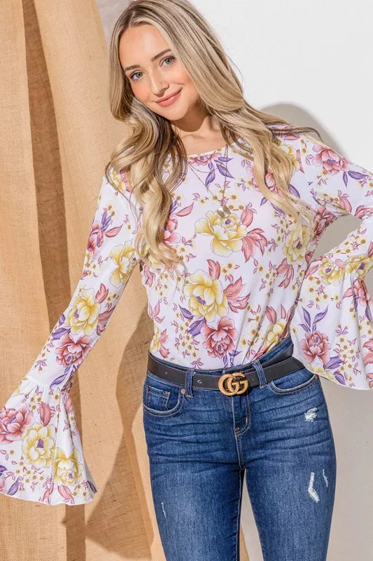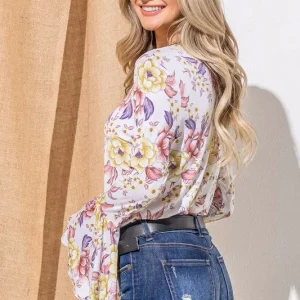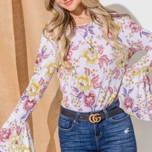 Floral Printed Bell Sleeve Casual Top – Mustard Mauve