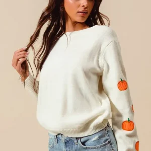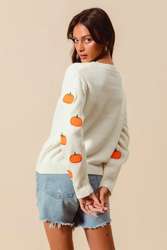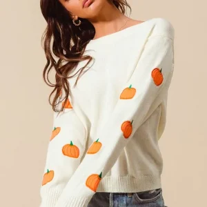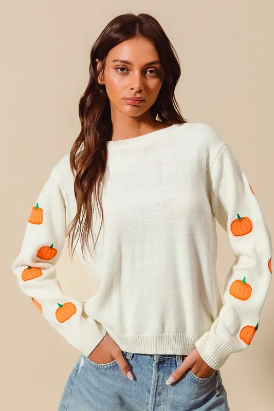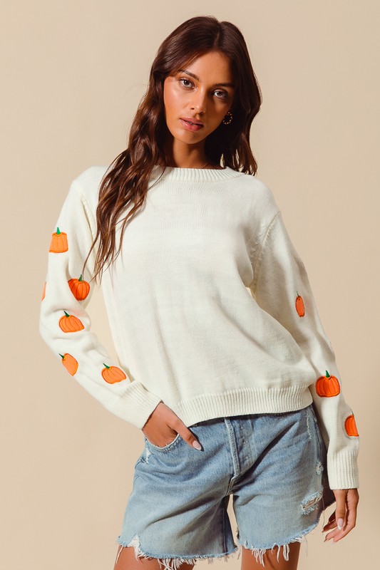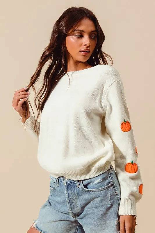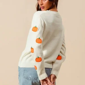 Halloween Pumpkin Applique Embroidered Sweater Top – Ivory