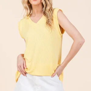 The rib knit V-neck tank is a stylish and versatile piece for your wardrobe. The ribbed texture adds depth and interest to the tank, while the V-neckline offers a flattering and chic look. Perfect for layering or wearing on its own, this tank can be dressed up or down for various occasions. Pair it with jeans, shorts, or a skirt for a classic and timeless outfit.