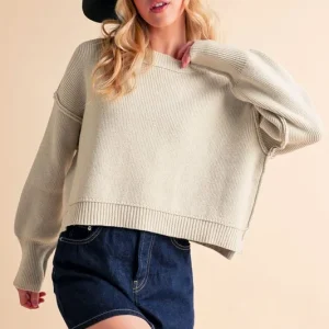 Ribbed Hem Exposed Seam Round Neck Sweater – Pearl