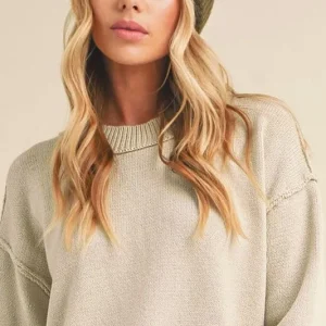 A ribbed hem exposed seam round neck sweater is a cozy and stylish option for cooler weather. The ribbed hem adds texture and detail to the sweater, while the exposed seams give it a trendy and edgy look. The round neck provides a classic and versatile neckline that can be easily styled with various outfits. This sweater is perfect for keeping you warm and fashionable, whether you’re running errands or relaxing at home.