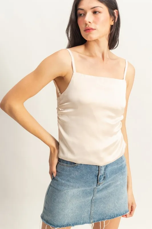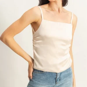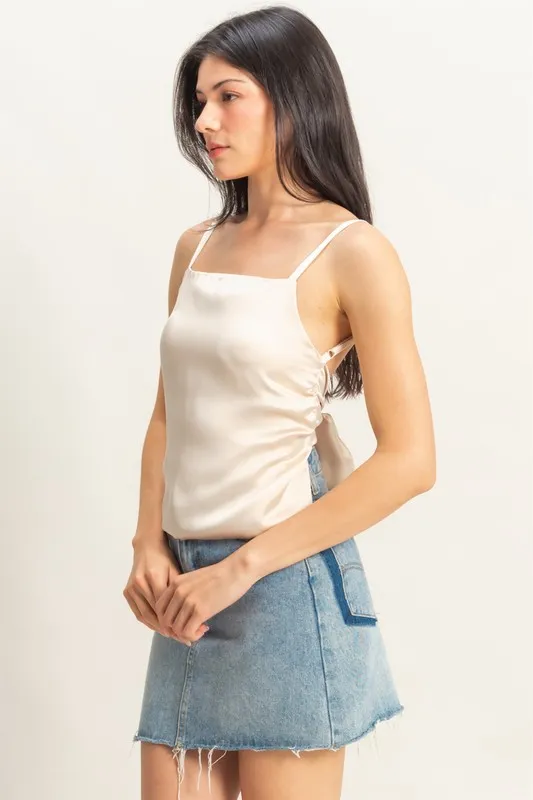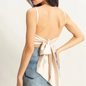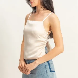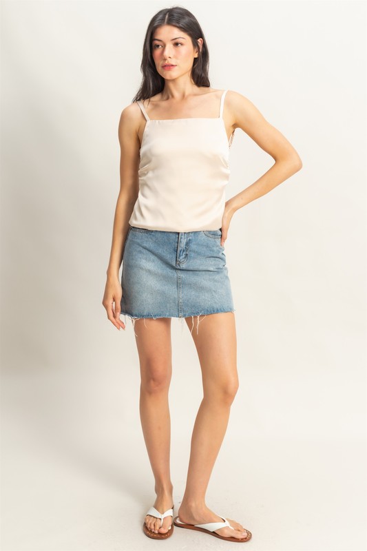 The satin back tie detail cami is a sophisticated and luxurious piece that adds a touch of elegance to your outfit. The satin fabric offers a silky and smooth texture, perfect for dressing up any look. The back tie detail adds a feminine and chic element, allowing you to adjust the fit to your liking. This cami is versatile and can be styled in various ways – wear it alone with jeans or dress it up with a blazer and trousers for a more formal look. The satin fabric and tie detail create a sleek and stylish ensemble that is perfect for both casual and dressier occasions.