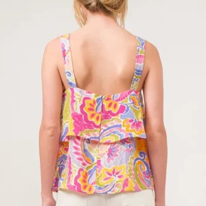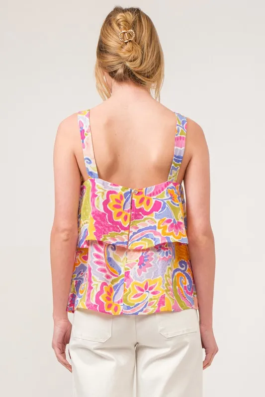 Square Neck Tiered Paisley Printed Top features a stylish square neckline. The top is designed with tiered layers for a unique and flattering silhouette. The paisley print adds a touch of bohemian flair to this versatile piece.