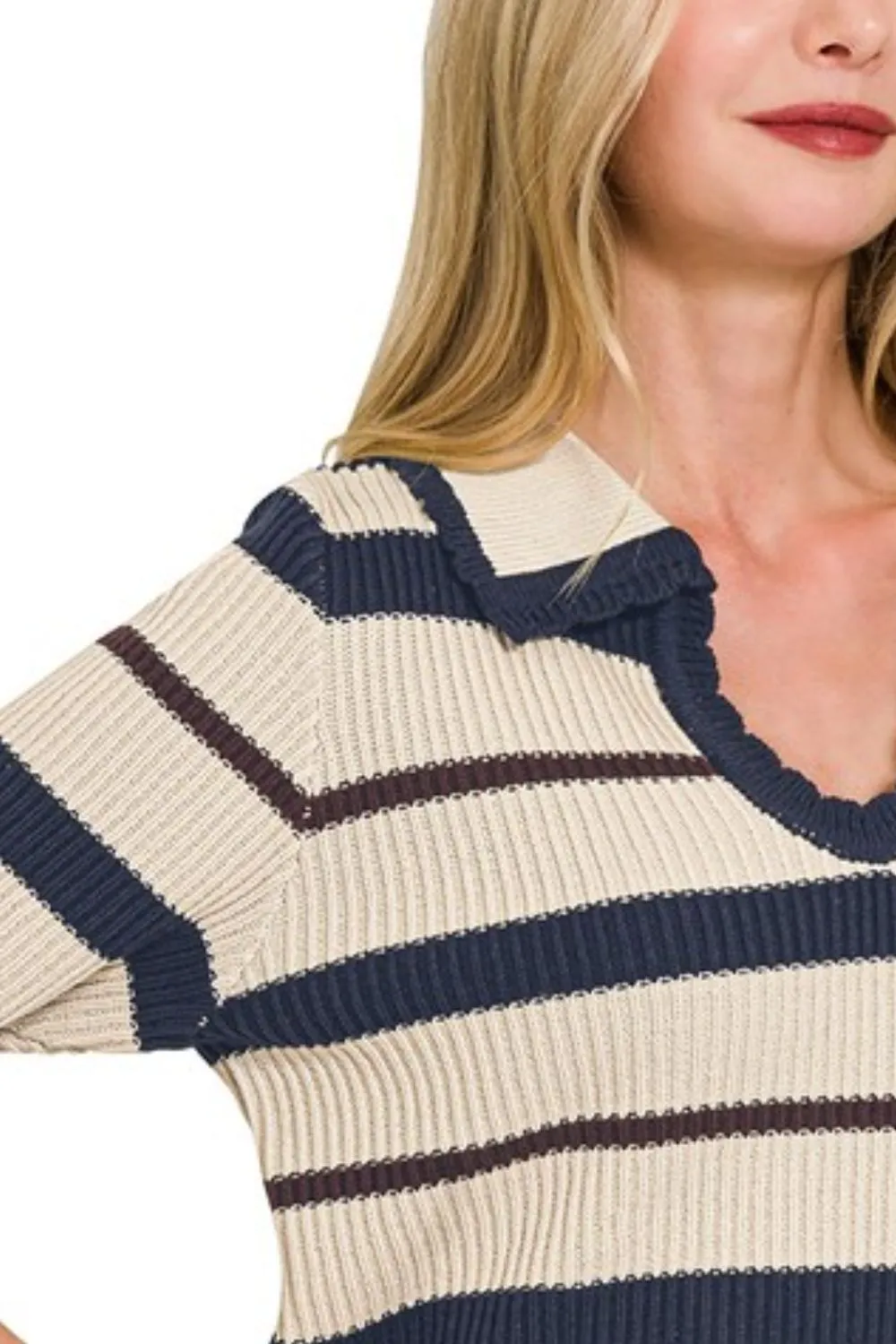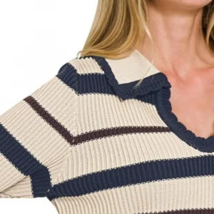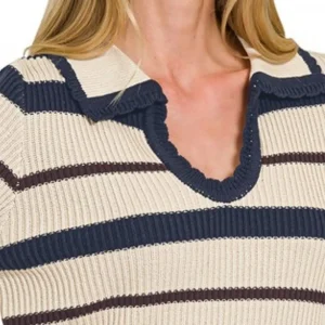 Striped Collared Short Sleeve Cropped Sweater – Navy