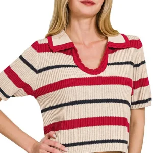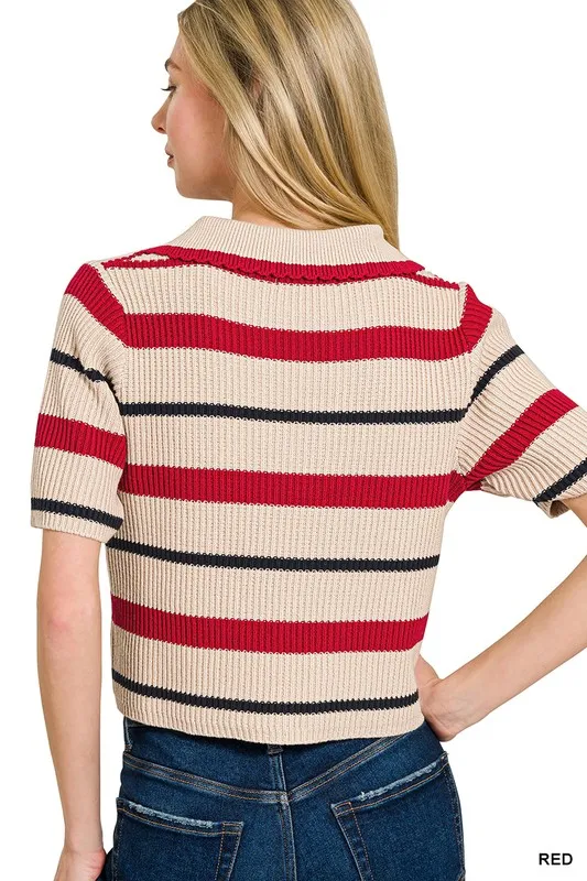 Striped Collared Short Sleeve Cropped Sweater – Red