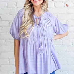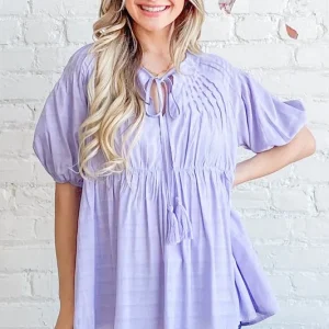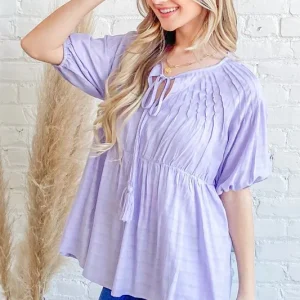 Textured Pintuck Blouse Top with Tassels – Lavender