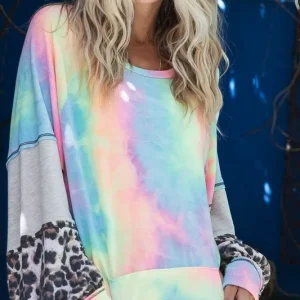 The Tie Dye French Terry Pullover Top with Contrast detailing combines comfort with style for a trendy look. The tie-dye pattern adds a playful and colorful touch to the French terry fabric, making it a casual yet fashionable piece. The contrast detailing adds visual interest and helps highlight the tie-dye design. This pullover top is perfect for a relaxed and laid-back outfit with a pop of personality. Pair it with your favorite jeans or leggings for a cozy and chic look. The combination of tie-dye and contrast detailing creates a modern and stylish top that is perfect for casual occasions.