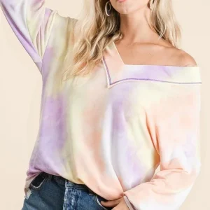Tie Dye French Terry V-Neck Top with Puff Sleeves – Lavender Multi