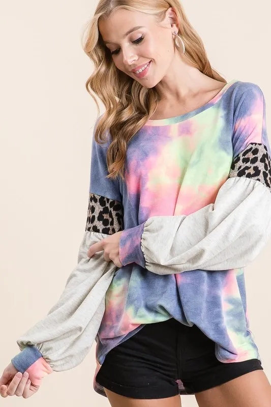 Tie Dye Terry Top with Contrast Puff Sleeves – Charcoal Tie Dye