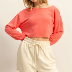 Boat Neck Long Sleeve Cropped Top – Coral
