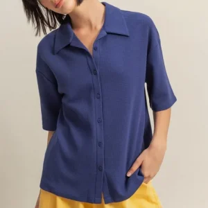 Collared Neck Button Down Waffle Shirt – Dusty Indigo