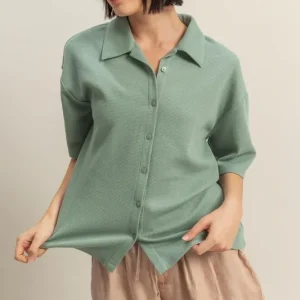 Collared Neck Button Down Waffle Shirt – Sage Green